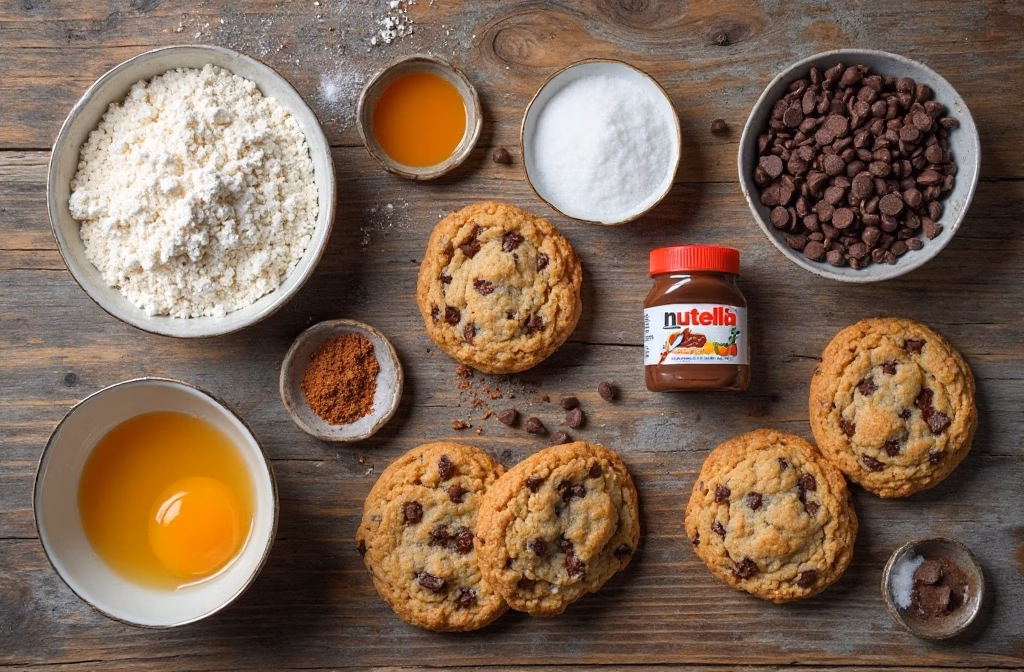 ingredients image of realistic and creative flat lay shot showcasing the ingredients for Nutella Chocolate Chip Cookies including flour butter sugar brown sugar Nutella chocolate chips baking soda salt eggs and vanilla extract all artfully arranged on a rustic wooden surface with soft natural lighting
