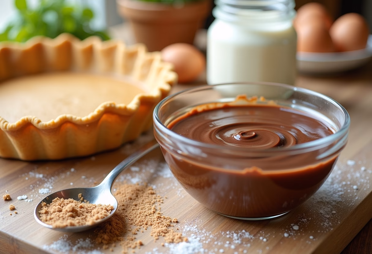 - Pour the chocolate filling into the cooled pie crust.