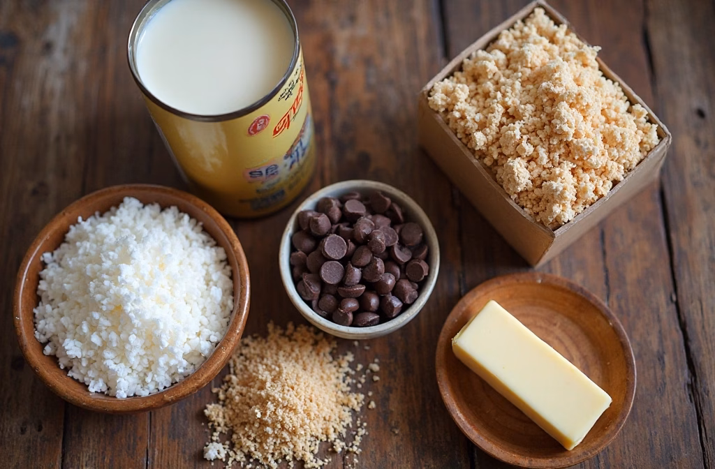 ingredients image of Top-down shot of a rustic wooden table displaying the ingredients for Magic Cookie Bars: a can of condensed milk, a bowl of chocolate chips, a pile of shredded coconut, a box of graham cracker crumbs, and a stick of butter. Soft, natural lighting. Shallow depth of field.