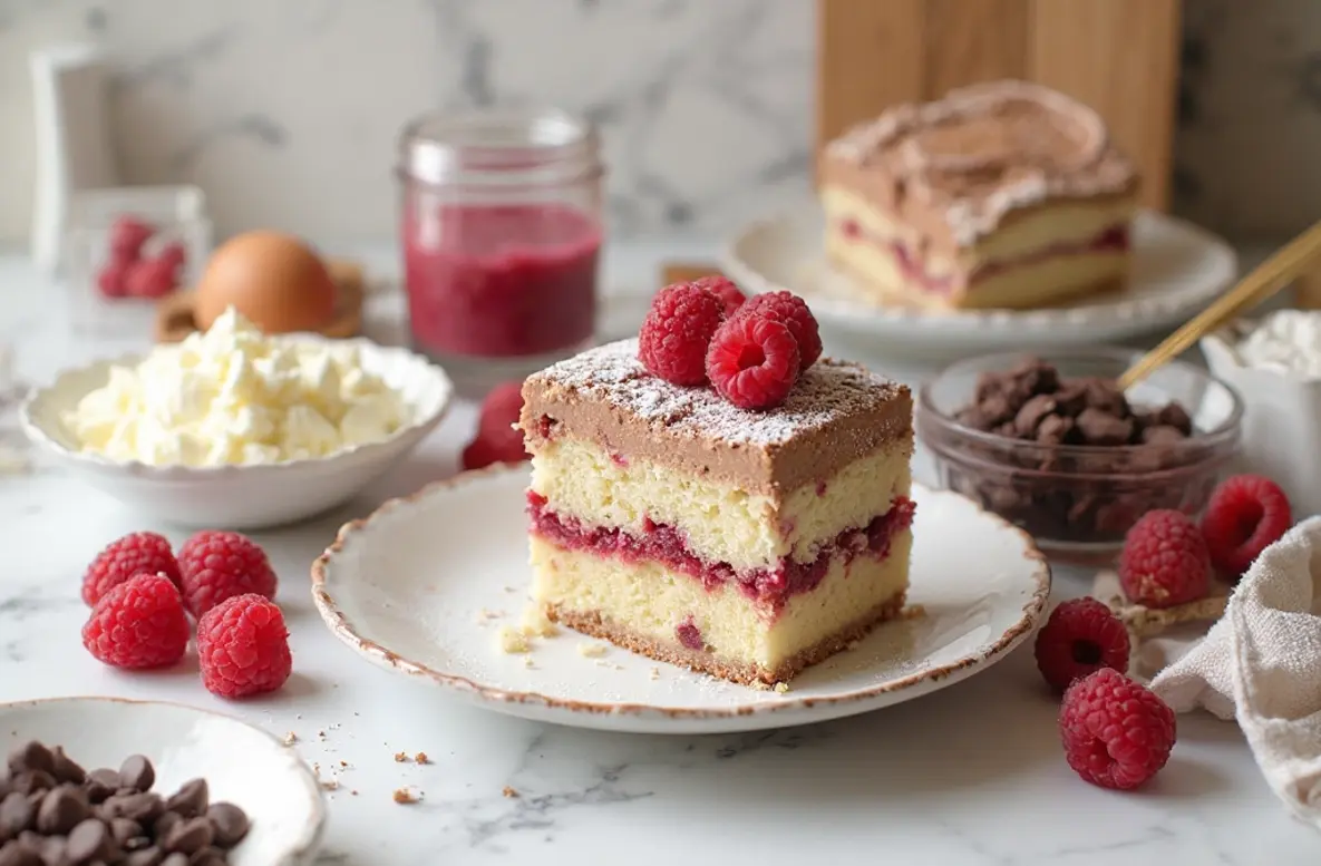 recipe image of unsalted butter granulated sugar large eggs unsweetened cocoa powder all purpose flour cream cheese fresh or frozen raspberries vanilla extract salt baking powder sour cream lemon juice dark chocolate chopped white chocolate chips fresh raspberries for topping pink food coloring raspberry jam homemade or store bought cornstarch brown sugar semi sweet chocolate chips arranged on a white marble kitchen counter healthy clear glass bowls rustic brown wooden kitchen sets soft diffuse daylight