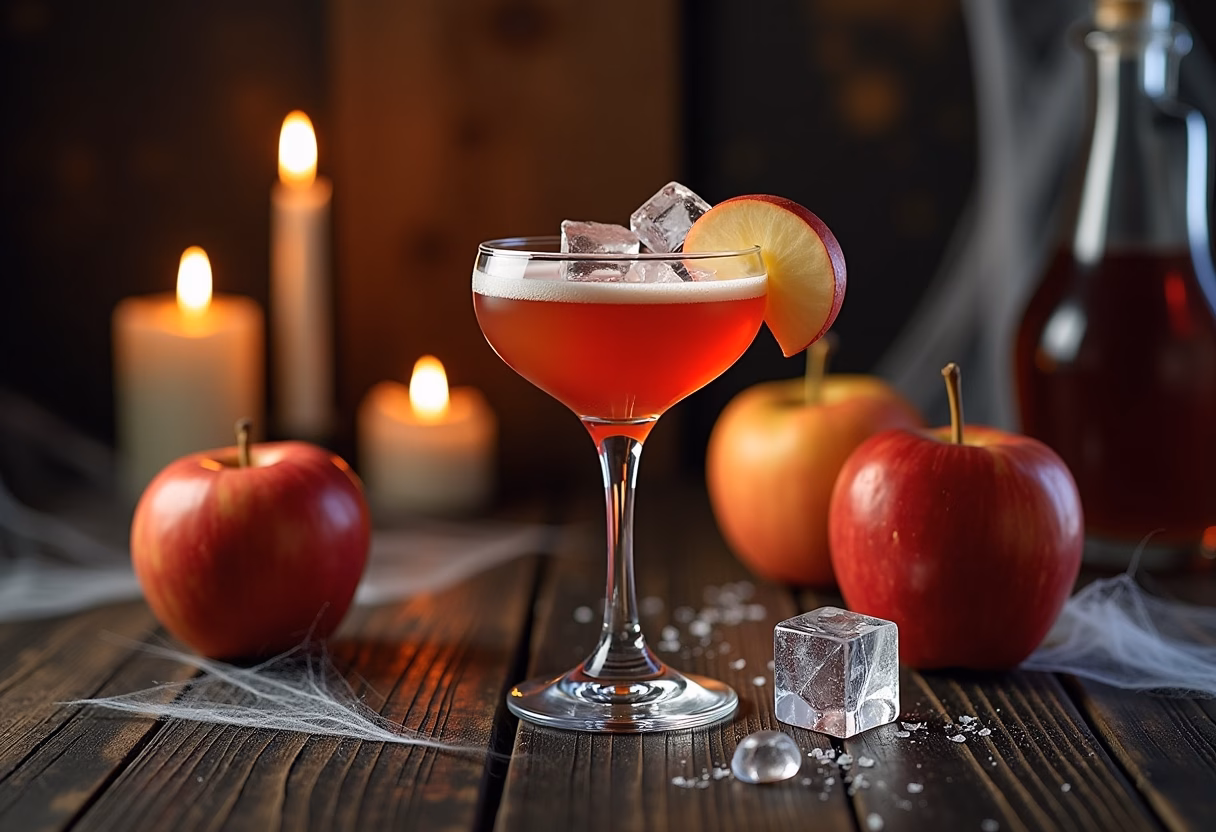 - Garnish: Apple slices, rock candy sticks, black sanding sugar