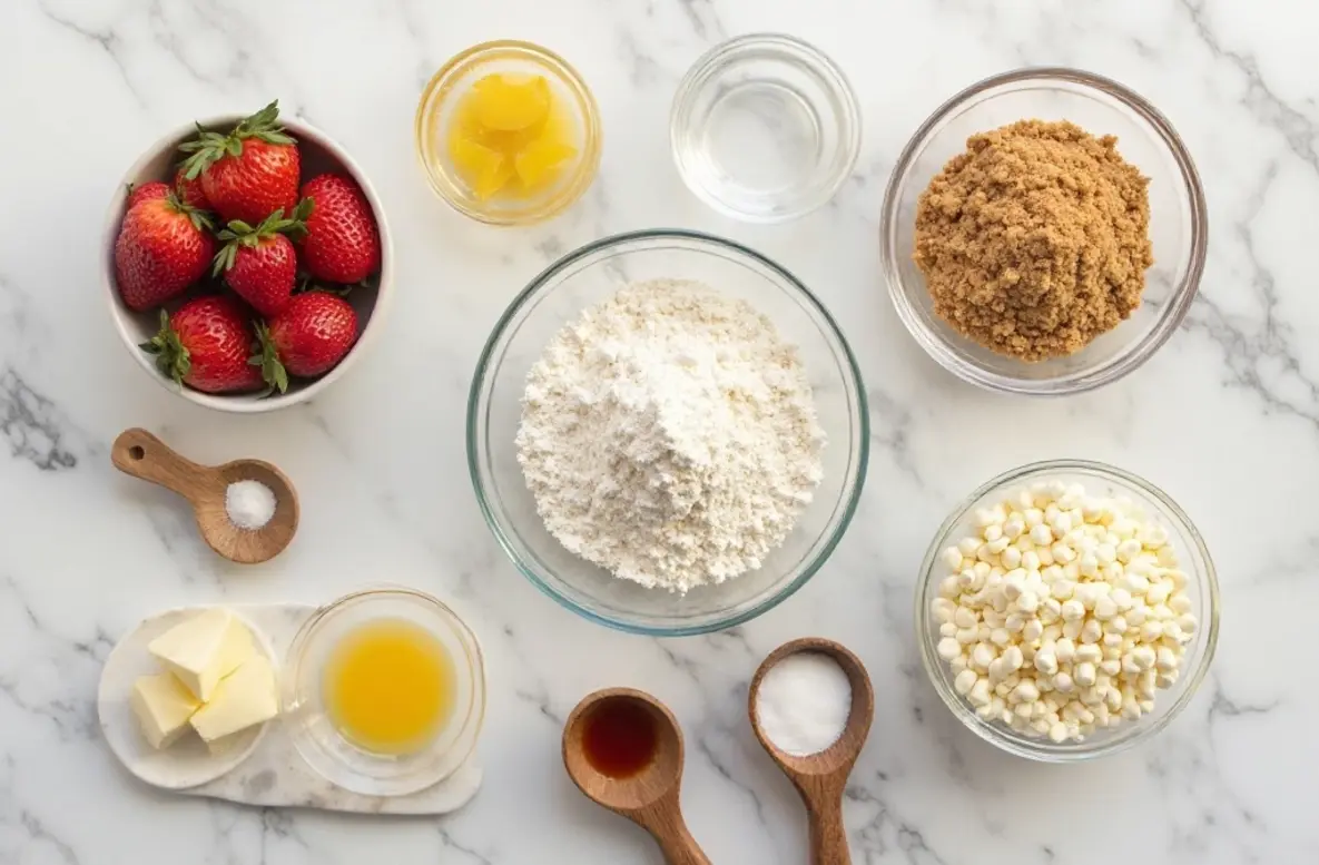 recipe image of a top down mise en place shot showing fresh strawberries cream cheese butter flour sugar brown sugar vanilla extract egg baking powder baking soda salt white chocolate chips graham cracker crumbs lemon zest lemon juice arranged on a white marble kitchen counter with healthy clear glass bowls and rustic brown wooden kitchen sets under soft diffuse daylight