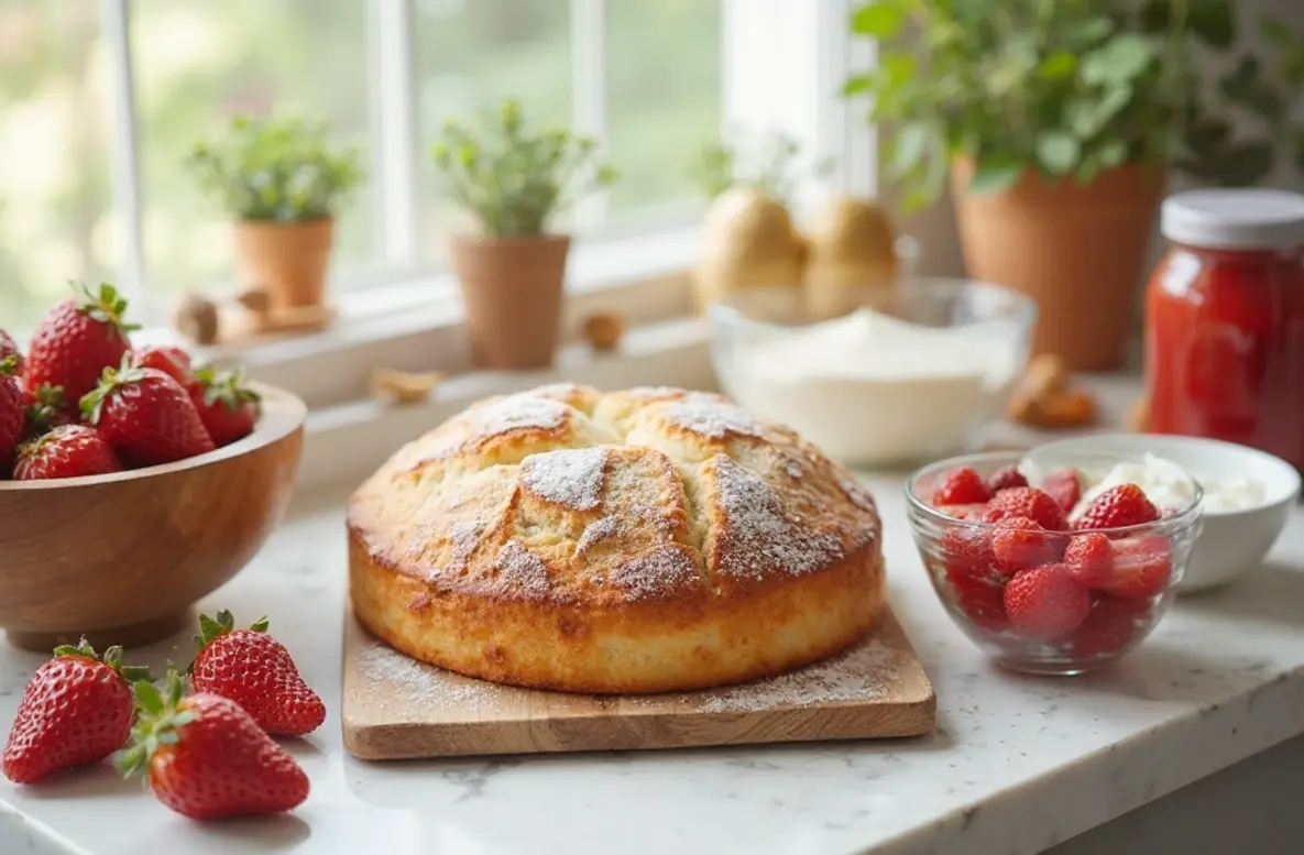 recipe image of fresh strawberries strawberry preserves strawberry jam active dry yeast bread flour all purpose flour whole milk butter salted eggs sugar cinnamon nutmeg lemon juice lemon zest cream cheese powdered sugar heavy cream vanilla extract vanilla bean paste cornstarch salt brown sugar oil baking powder baking soda freeze dried strawberries strawberry compote arranged on a white marble kitchen counter with healthy clear glass bowls and rustic brown wooden kitchen sets under soft diffuse daylight overlooking a window